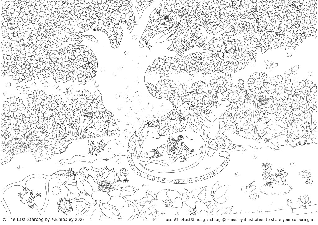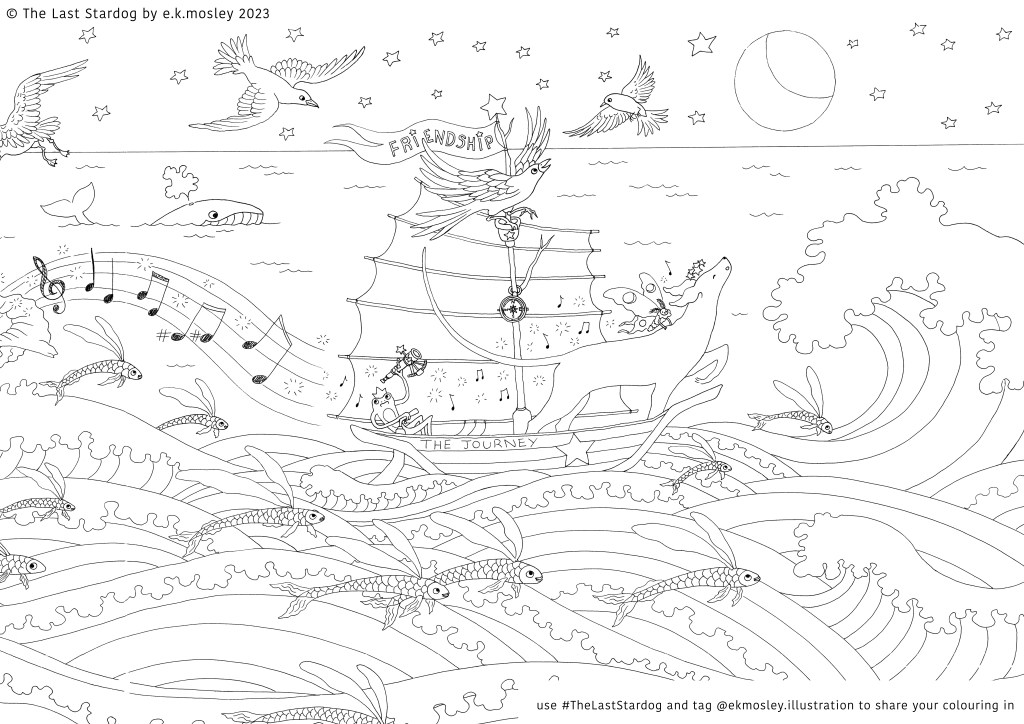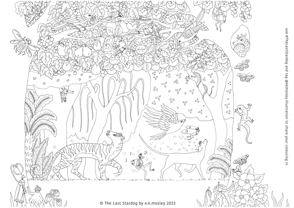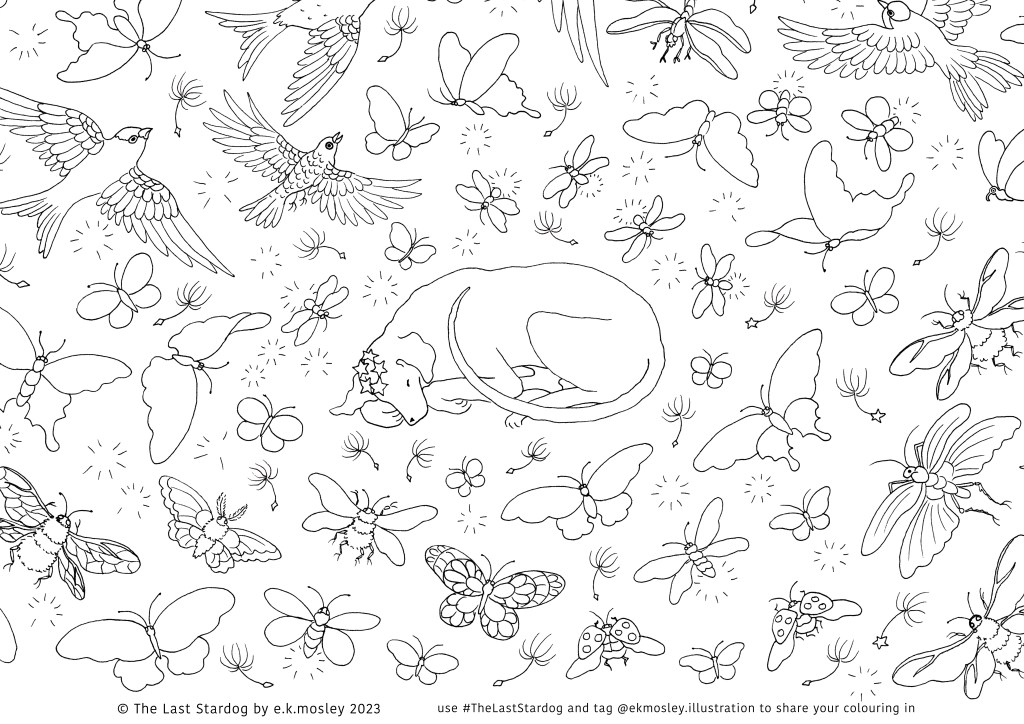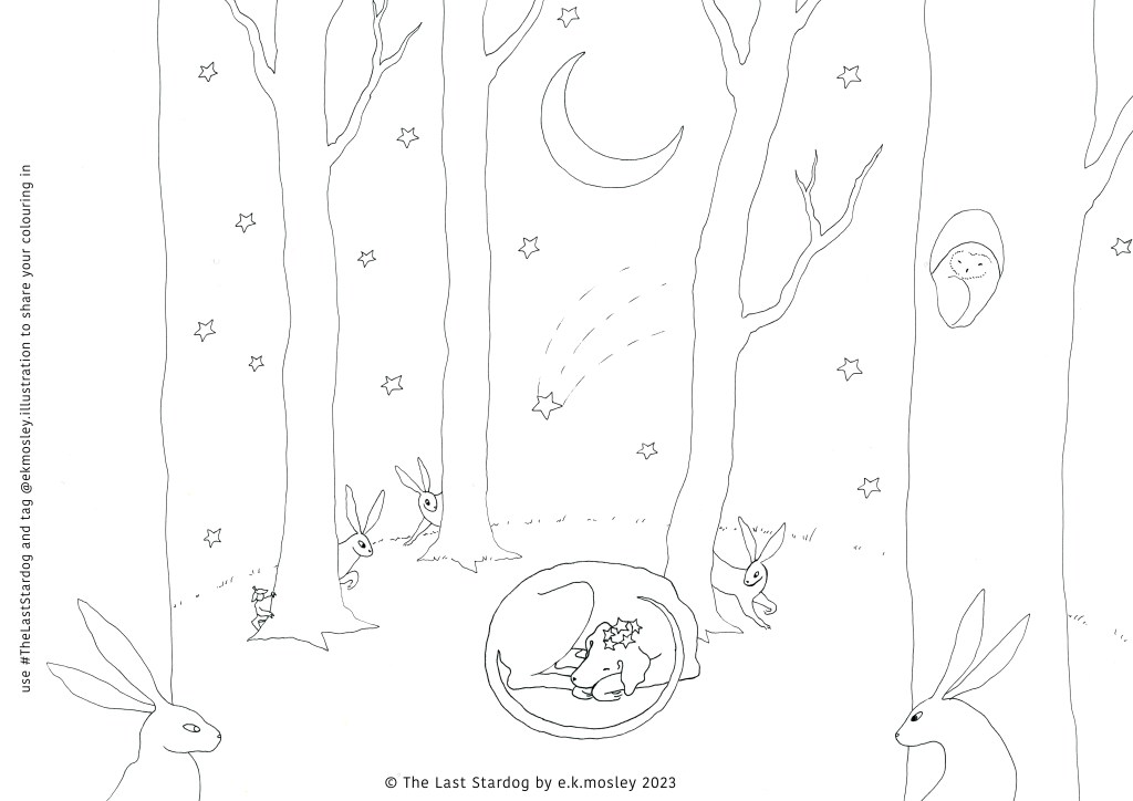 And if you decide to share your beautiful creations please tag me @ekmosley.illustraion and use the hashtag #thelaststardog because I would love to see all the brilliant colours you chose to colour Stardog’s world. Have fun! 🙂