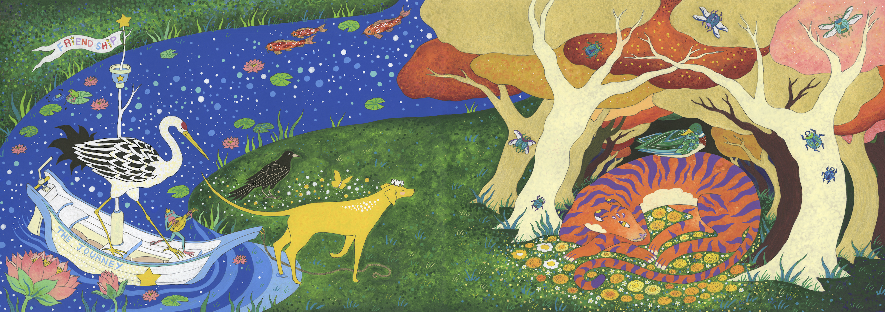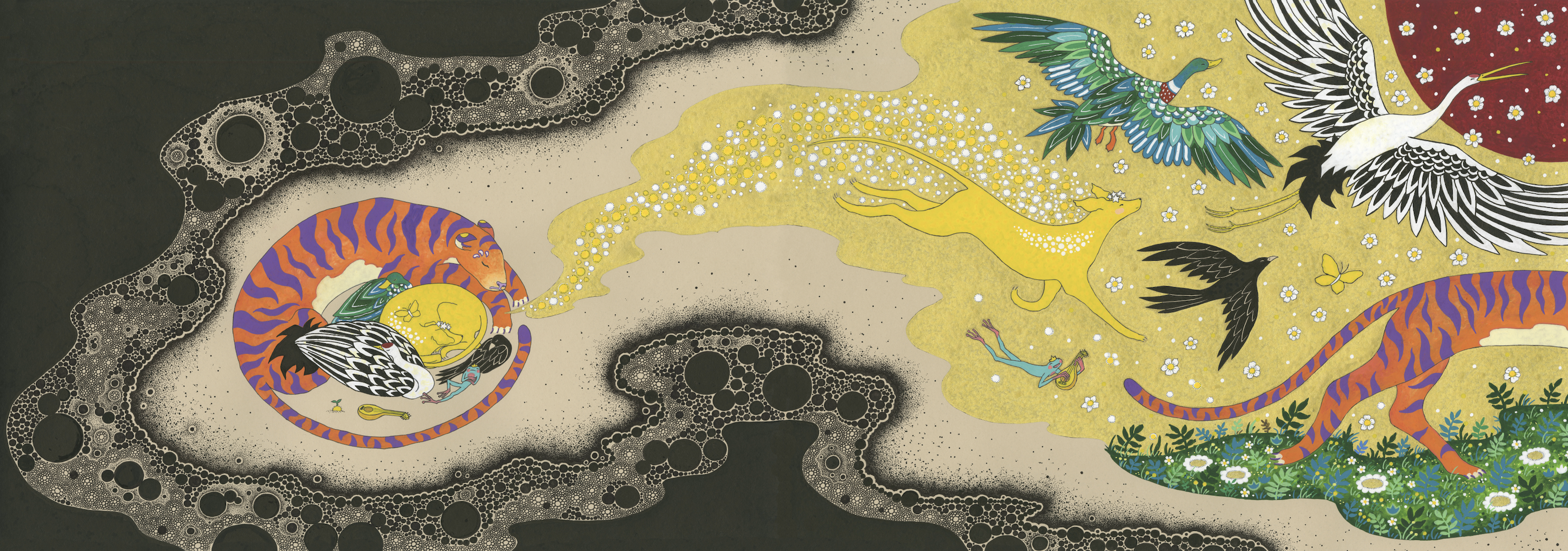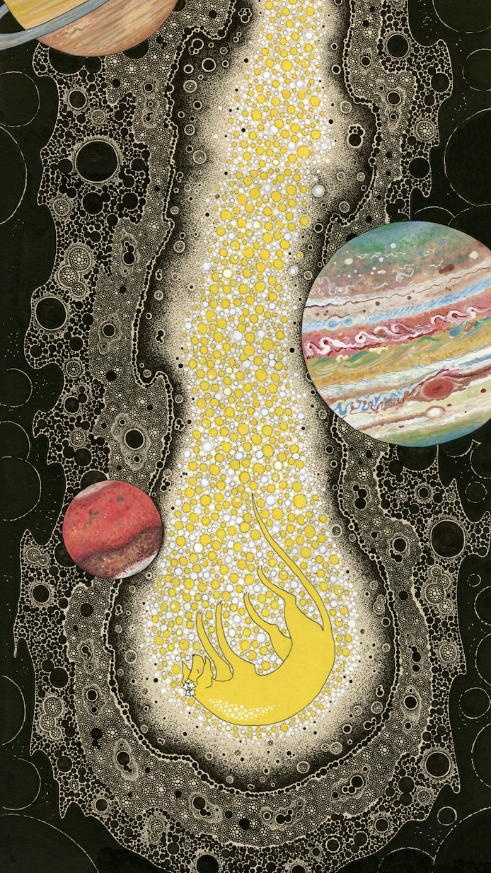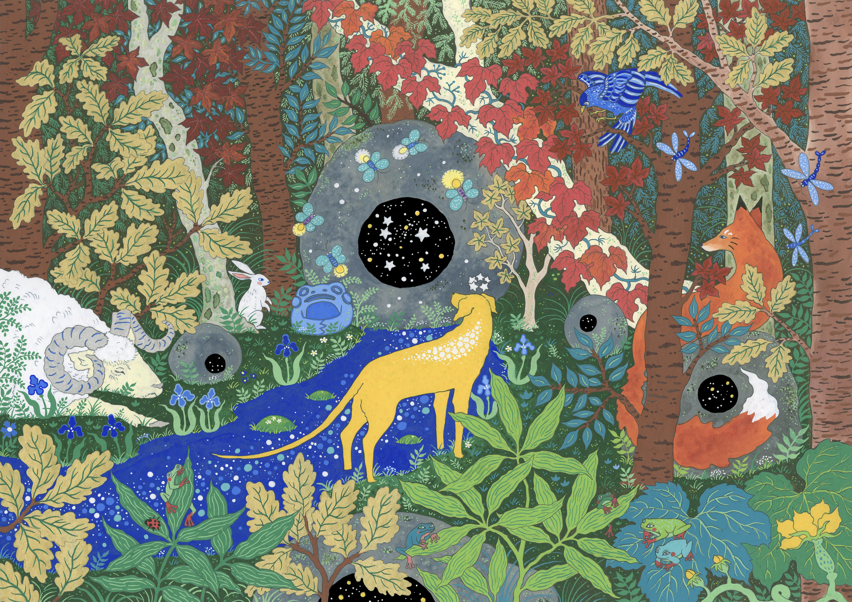 This illustration is one of the final pages in The Last Stardog. The little yellow dog in the painting is my old gold childhood Labrador. I began painting these imagined landscapes in order to create a wild and wonderful world for her to explore.