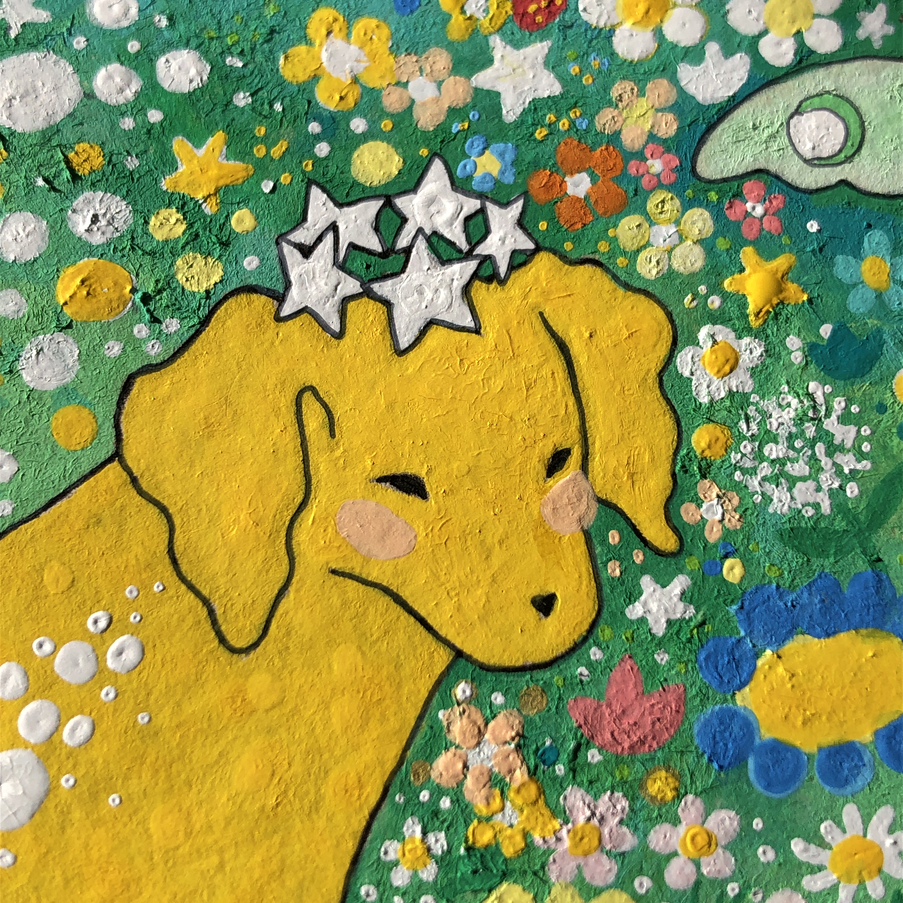 The little yellow dog in the painting is my old gold childhood Labrador.